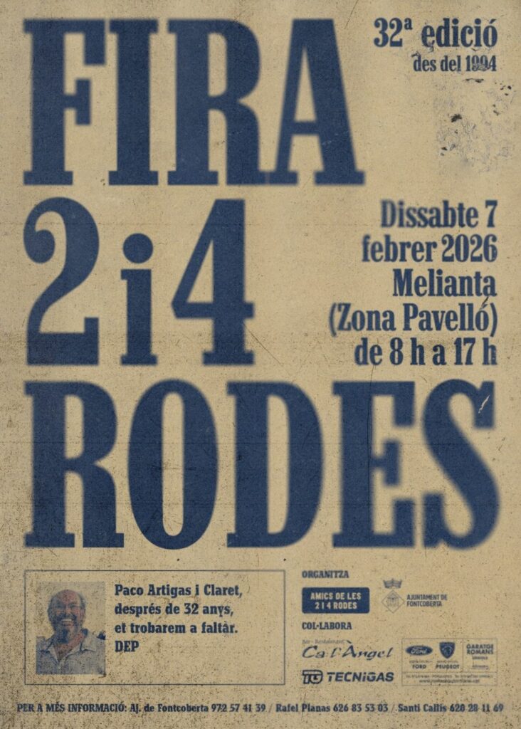 La Fira de les 2 i 4 Rodes de Fontcoberta arriba aquest dissabte 7 de febrer de 2026 a la seva 32a edició, consolidant-se com una cita imprescindible per als amants dels vehicles clàssics i antics. Se celebrarà a Melianta (Zona Pavelló) de 8 del matí a 5 de la tarda, i oferirà una gran varietat de parades especialitzades en recanvis per a motos, cotxes, bicicletes, tractors i carros, així com llibres i revistes sobre vehicles, tant nacionals com estrangers. És l’espai ideal per a col·leccionistes, restauradors i apassionats del món del motor.