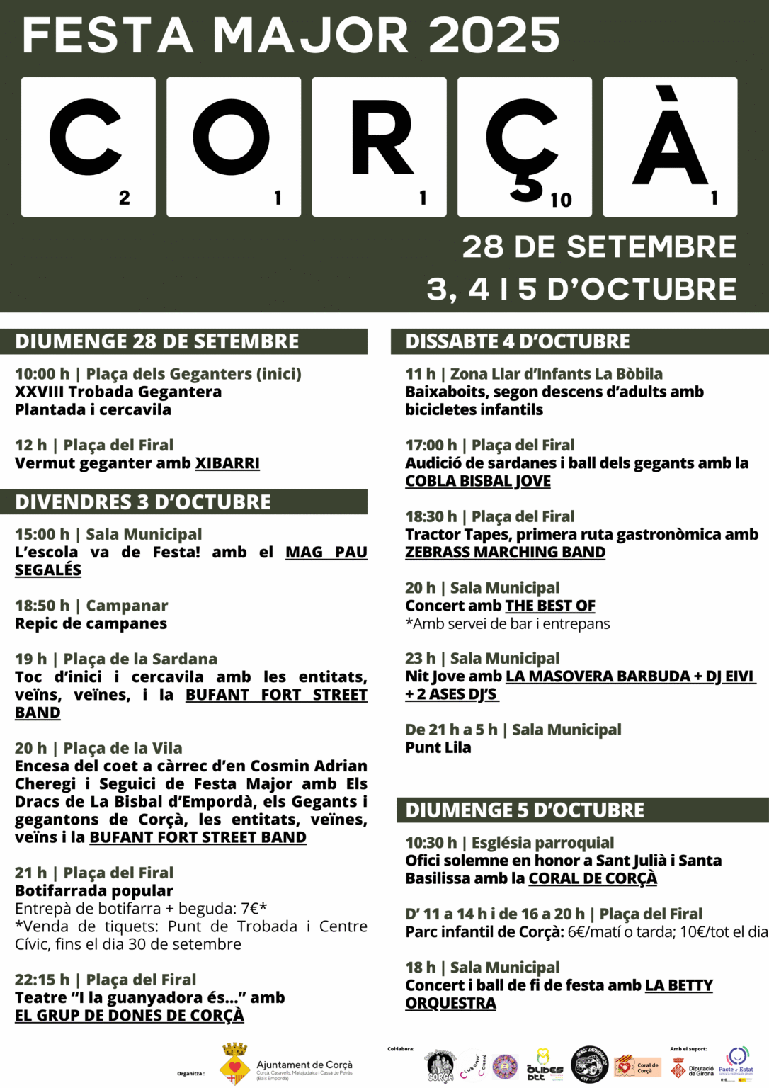 Corçà es vesteix de festa! Del 28 de setembre al 5 d’octubre de 2025, arriba una nova edició de la Festa Major de Corçà, amb una programació plena d’activitats per a tots els gustos i edats. Gegants, concerts, sardanes, teatre, tapes, espectacles infantils i molt més t’esperen en un ambient festiu i acollidor que combina … Continua llegint Festa Major de Corça 2025
