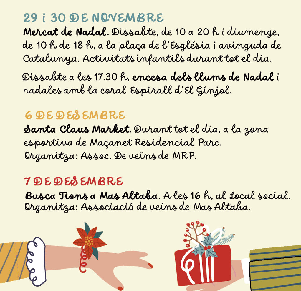 - 29 i 30 de novembre: Mercat de Nadal a la plaça de l’Església i avinguda de Catalunya, amb activitats infantils i encesa de llums dissabte a les 17.30 h amb la coral Espirall d’El Gínjol.
