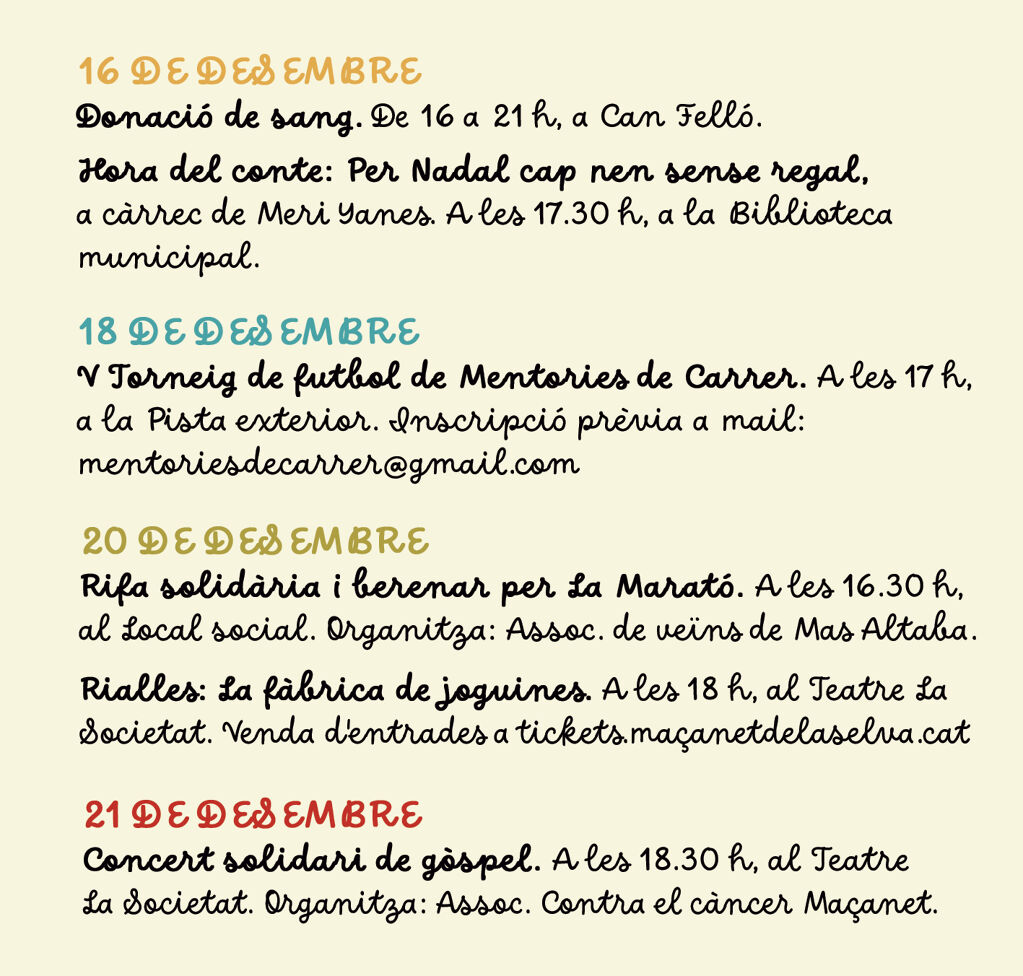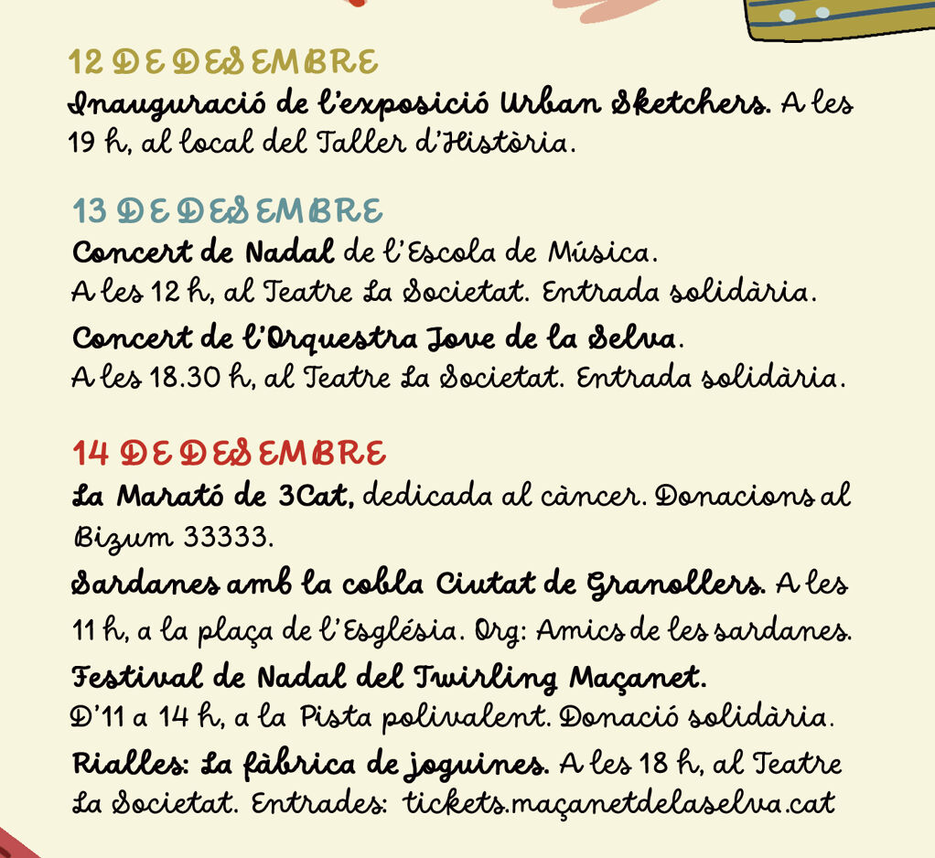 - 14 de desembre: Sardanes amb la cobla Ciutat de Granollers, Festival del Twirling Maçanet i l’espectacle familiar Rialles: la fàbrica de joguines (entrades a tickets.masanetdelaselva.cat).