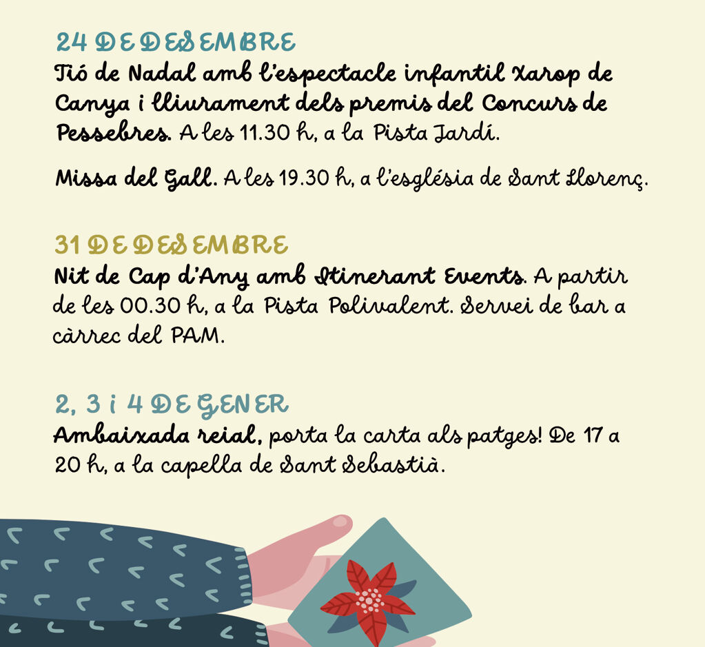 - Parc Infantil de Nadal: del 27 al 30 de desembre a la Pista Polivalent. Preu: 6 €/dia o 20 €/setmana.