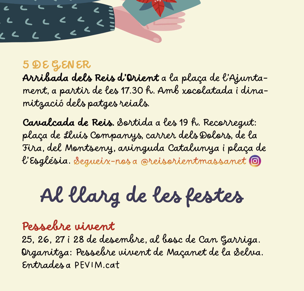 - 5 de gener: Arribada dels Reis d’Orient i Cavalcada (amb xocolatada i animació).
