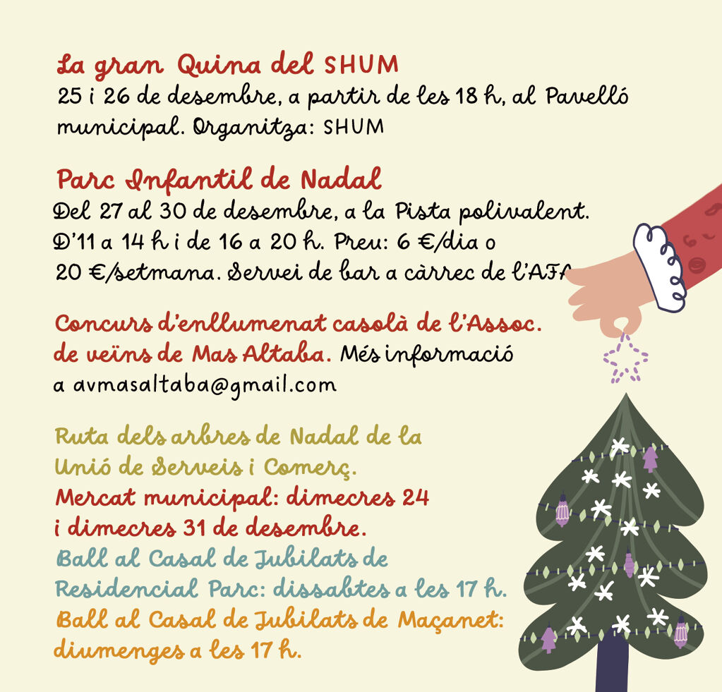 - Concurs d’enllumenat casolà, Ruta dels arbres de Nadal, mercats municipals especials, i balls al Casal de Jubilats.