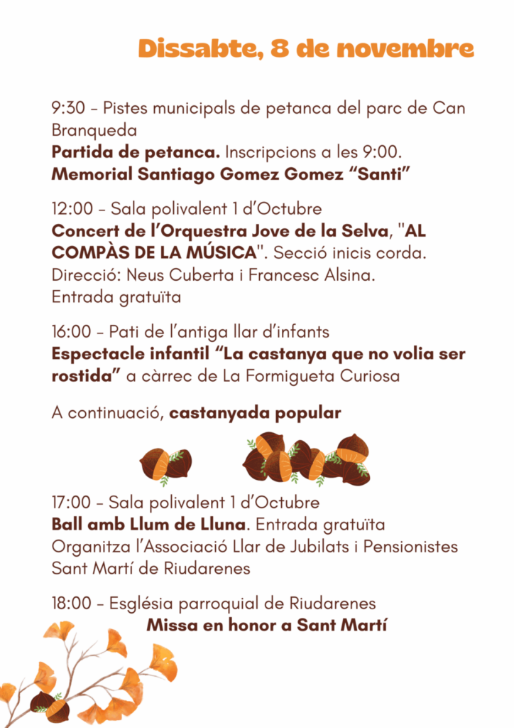 Del 7 al 9 de novembre de 2025, Riudarenes es vesteix de festa amb una programació ben diversa per celebrar Sant Martí, patró del municipi. Des d’espectacles teatrals com Les Coses Excepcionals de Sixto Paz fins a trobades de tractors antics, puntaires i música en directe, cada dia hi haurà activitats pensades per a totes les edats i gustos. El dissabte destaca la castanyada popular, el concert de l’Orquestra Jove de la Selva i l’espectacle infantil La castanya que no volia ser rostida, mentre que diumenge tindrà lloc l’emotiva proclamació de l’Hereu i la Pubilla de Riudarenes 2025 i un vermut popular obert a tothom.