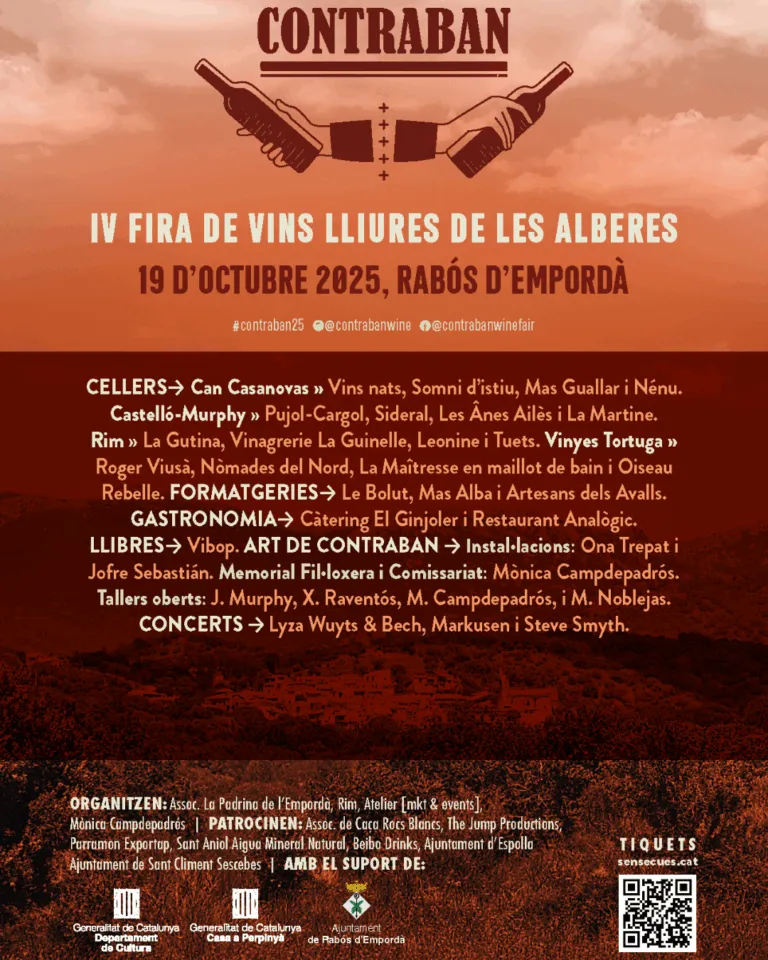 El pròxim 19 d’octubre, Rabós d’Empordà acollirà la IV edició de Contraban – Fira de Vins Lliures de les Alberes, una cita singular per descobrir vins naturals i projectes vinícoles independents amb ànima pròpia. Més de 20 cellers com Can Casanovas, Vinyes Tortuga, Rim o Castelló-Murphy compartiran els seus vins en un entorn immillorable, acompanyats de formatgeries artesanes com Le Bolut, Mas Alba i Artesans dels Avalls, així com propostes gastronòmiques a càrrec d’El Ginjoler i Restaurant Analògic.
