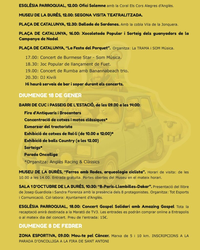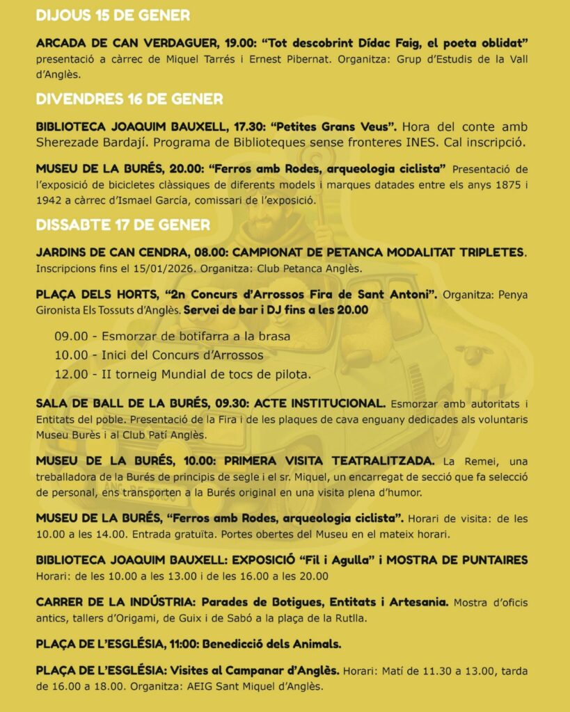 La XXIX Fira de Sant Antoni d’Anglès, que se celebrarà del 15 al 18 de gener de 2026, arriba carregada d’activitats per a tots els públics i manté ben viva la tradició d’hivern del municipi. El programa inclou des de concerts, exposicions i tallers fins a mostres d’oficis, visites teatralitzades i activitats populars com el Concurs d’Arrrossos, la benedicció dels animals, el Campionat de Petanca, i l’esperada Festa del Porquet amb música i gastronomia a la Plaça Catalunya.