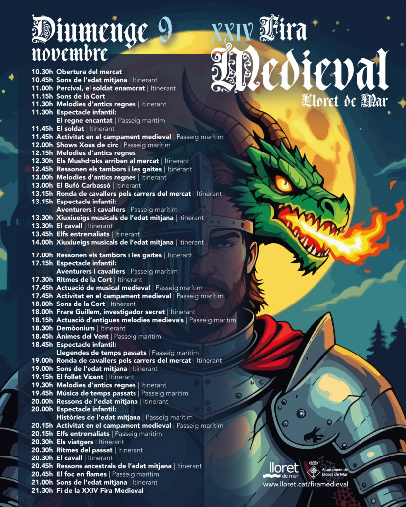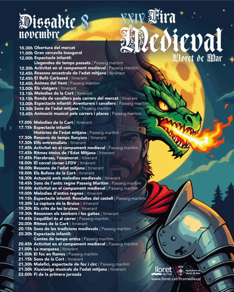 El mercat medieval estarà obert tot el dia, fins a les 22 h, amb espectacles constants al passeig marítim i al centre històric. Aquesta edició forma part de la Festa Major de Sant Romà, un dels esdeveniments més emblemàtics de Lloret de Mar.