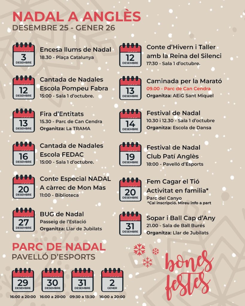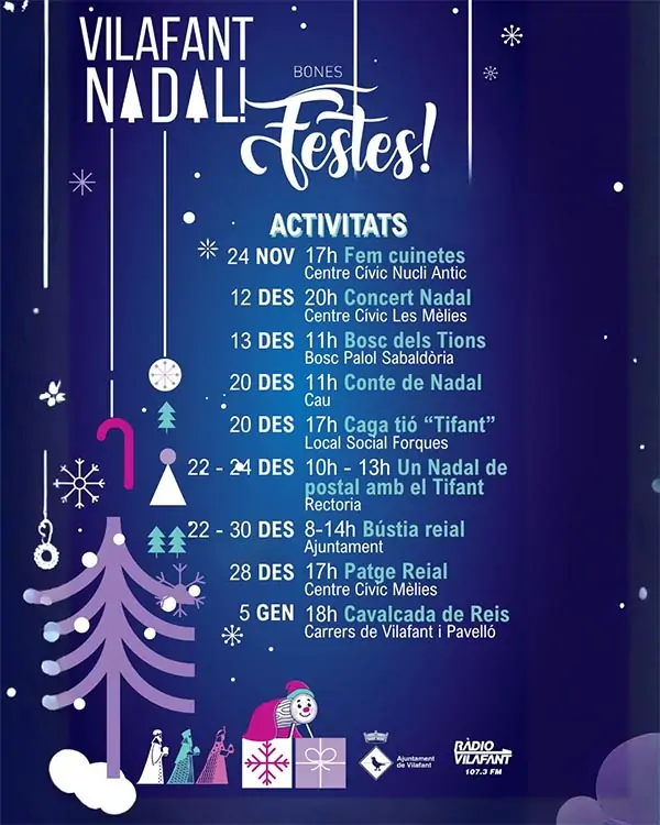 La capital del Baix Empordà desplega diverses activitats el dissabte 20 de desembre. D’una banda, el Mercat de Nadal (del 20 de desembre al 4 de gener) s’instal·la al carrer Major i ofereix parades d’artesania i regals. D’altra banda, el mateix dissabte se celebra la Fira d’Entitats al carrer Cervantes de 10.00 a 14.00 h, on les entitats locals i fundacions com Oncolliga disposen de parades solidàries. A la tarda, els nens esperen l’arribada del tió a la plaça del Pedró (24/12) i, entre el 27 i el 30 de desembre, el parc infantil omple el pavelló amb activitats diverses.
