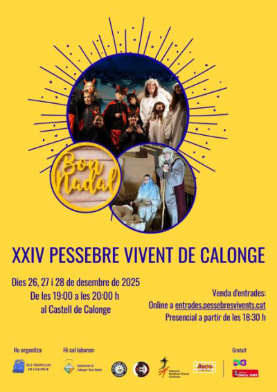 El Pessebre Vivent de Calonge celebra 24 anys de tradició amb noves representacions els dies 26, 27 i 28 de desembre de 2025, a les 19:00 h. L’espectacle es desenvolupa a l’entorn del Castell Medieval, un escenari patrimonial espectacular on el públic pot gaudir d’una vintena d’escenes en moviment, amb personatges vestits d’època que donen vida a escenes bíbliques i antics oficis catalans.