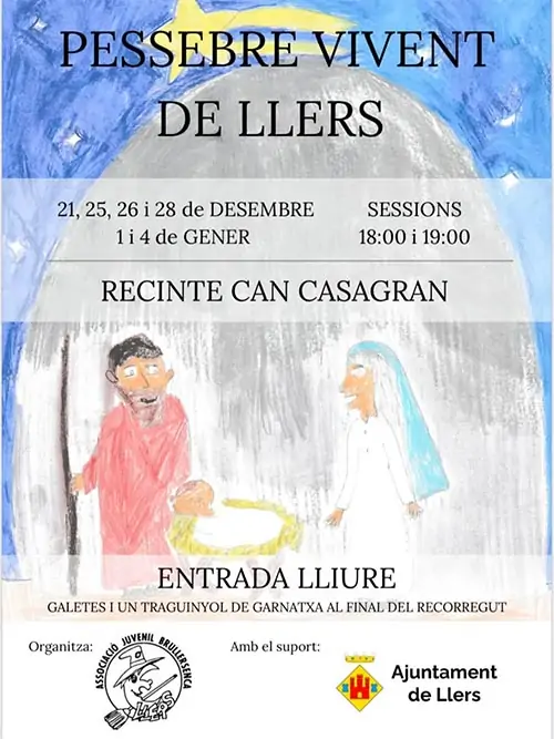El Pessebre Vivent de Llers torna aquest Nadal 2025 amb representacions els dies 21, 25, 26 i 28 de desembre, i l’1 i 4 de gener. Es farà als jardins de Can Casagran, a les 18:00 i 19:00 h. Entrada lliure i oberta a tothom. Una proposta ideal per viure el Nadal en família!