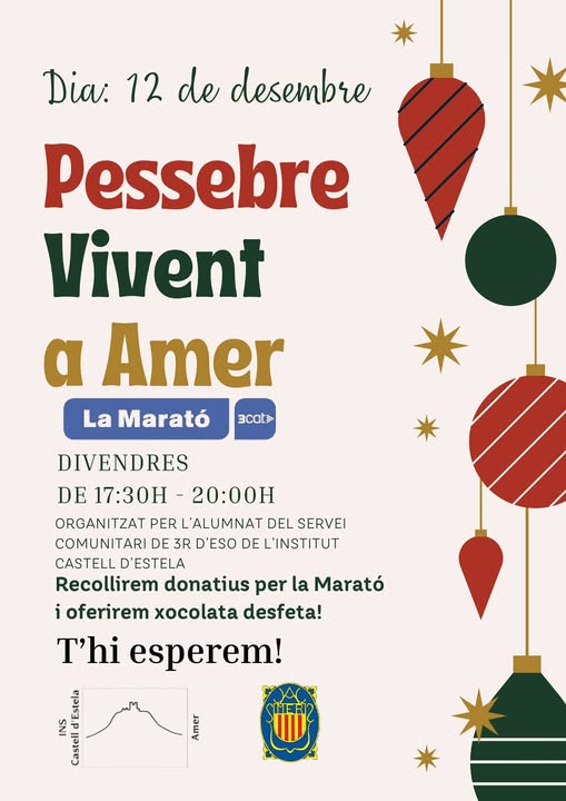 El proper divendres 12 de desembre de 2025, el municipi d’Amer viurà una tarda plena de màgia i solidaritat amb la celebració del seu Pessebre Vivent, una activitat organitzada pels alumnes de 3r d’ESO de l’Institut Castell d’Estela dins el seu projecte de servei comunitari.