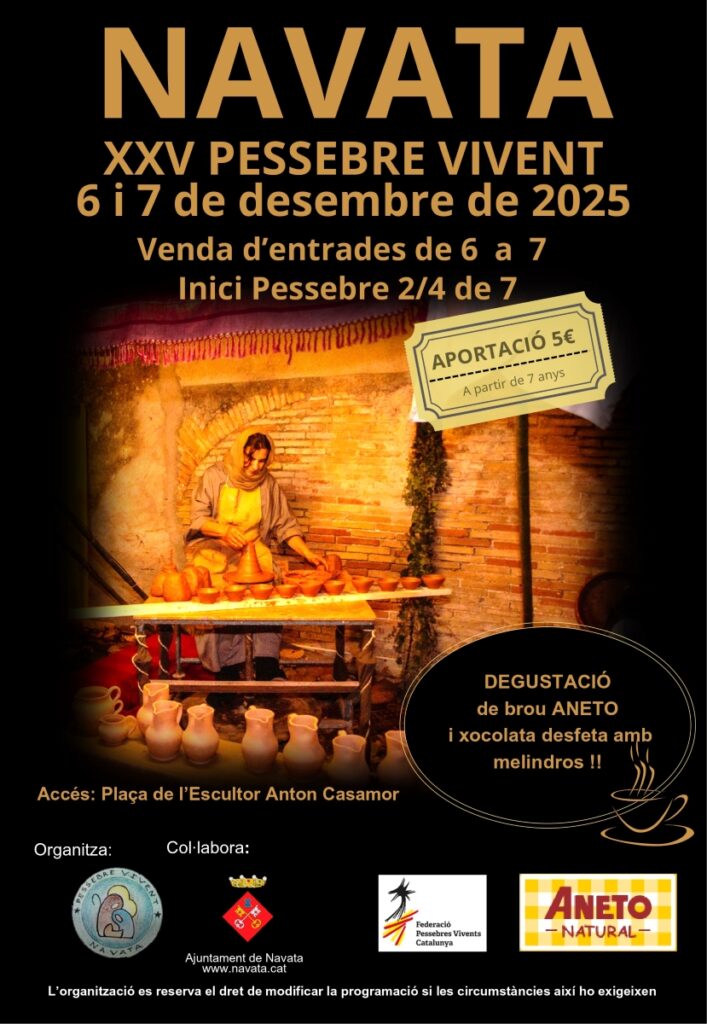 Els dies 6 i 7 de desembre de 2025, Navata celebrarà la 25a edició del seu Pessebre Vivent, un esdeveniment molt estimat que dona el tret de sortida a les festes nadalenques a la comarca. Amb inici a les 18:30 h i accés per la plaça Escultor Casamor, la representació ofereix un recorregut ple de simbolisme i emoció. Les entrades es poden adquirir el mateix dia, de 18:00 a 19:00 h, per un preu de 5 € (a partir de 7 anys). Organitzat pels Amics de Navata, aquest pessebre és una mostra de participació local i esperit nadalenc que ja fa un quart de segle que emociona grans i petits.