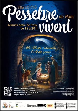 Aquestes festes de Nadal, el nucli antic de Pals acollirà la 38a edició del seu tradicional Pessebre Vivent, amb representacions els dies 26 i 28 de desembre de 2025, i l’1 i 4 de gener de 2026, de 18 a 20 h. Una proposta cultural i nadalenca molt esperada, ideal per gaudir en família. Les entrades es poden adquirir el mateix dia a la taquilla del pati de Ca la Pruna (de 17.30 a 19 h) o prèviament en línia a Codetickets. L’entrada és gratuïta per als menors de 12 anys, però també necessiten entrada per accedir-hi. Cal respectar les mesures de seguretat i els menors d’edat han d’anar sempre acompanyats d’un adult.