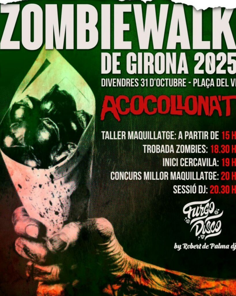 La Zombiewalk de Girona torna amb més força que mai per inaugurar el Festival de Cinema Fantàstic i de Terror Acocollona’t, que se celebrarà la primera setmana de desembre. El pròxim dia de la gran desfilada, a partir de les 15 h, començarà el taller de maquillatge zombie perquè puguis transformar-te en una autèntica criatura de l’inframón (preu entre 3 i 25 €, amb inscripció prèvia a reserves.acocollonat@gmail.com o presencialment). A les 19 h es presentaran les activitats oficials del festival, i a les 19.15 h s’iniciarà la gran caminada terrorífica pel Barri Vell, animada per les espectaculars Gàrgoles de Foc de Banyoles, que faran tremolar els carrers amb la seva posada en escena.